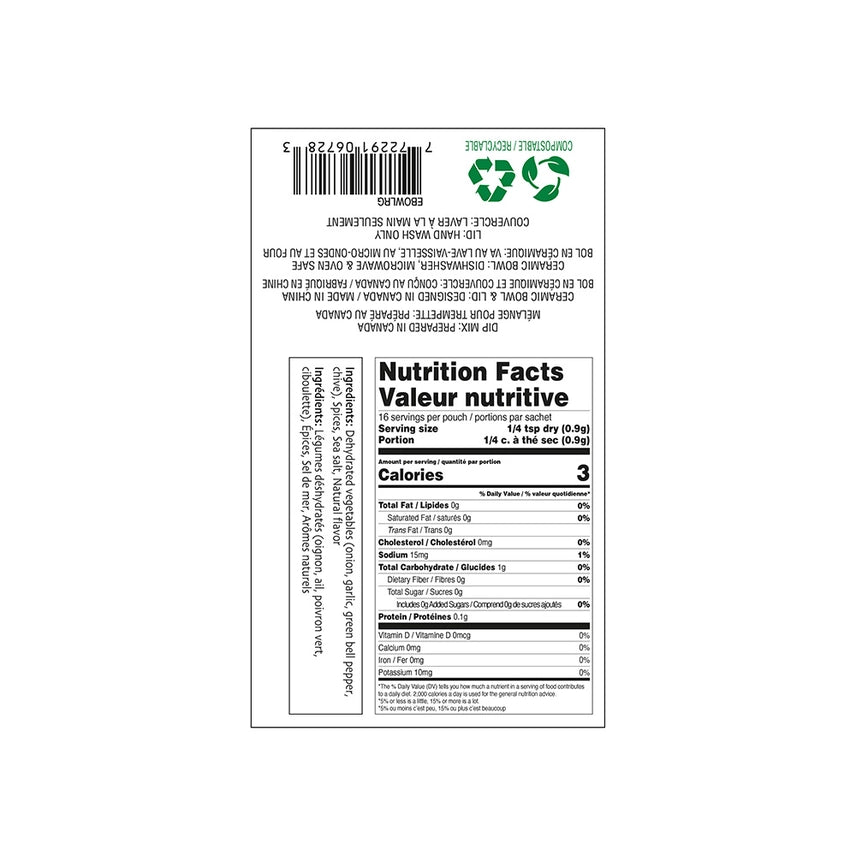 Roasted Garlic Dip Bowl Set includes a beautiful embossed, white ceramic dip bowl that holds a volume of 700ml (3 cups), with a plastic lid, a full-sized pouch of our Roasted Garlic Dip Mix and a recipe to make 2 cups of our bestselling dip. Elegant ceramic dip bowls are equally at home on the table or in the fridge, with a sealed plastic lid to keep your Gourmet du Village dip fresh and ready to serve, or to store leftovers. However, with our dip there probably won't be any leftovers…