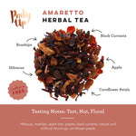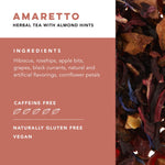 Inspired by the rich, nutty flavor of Amaretto liqueur, this naturally caffeine-free herbal tea combines sweet dried fruit, tangy hibiscus and rosehips, and natural almond flavor for a decadent infusion. Apple, grapes, and black currants add layers of fruity sweetness, while cornflower petals provide a delicate floral touch. Enjoy it on its own or add a splash of cream for an indulgent treat. * Herbal tea with almond and fruit notes * Tart, nutty, and aromatic flavor profile * Includes 15 oversized pyramid sachets * 100% compostable plant-based materials with no microplastics * Naturally caffeine-free for all-day enjoyment Ingredients: Hibiscus, rosehips, apple bits, grapes, black currants, natural and artificial flavorings, cornflower petals.