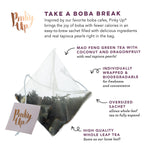 All the indulgence of your favorite boba tea, none of the guilt! Our delicious low-calorie Mochi Ice Cream Boba tea is made from whole leaf green tea, real tapioca, and the sweet and creamy flavors of coconut, pineapple, and dragon fruit inside the bag. (Hint: add a splash of your favorite milk!) Details: 12 over-wrapped pyramid sachets 6 calories per serving 10 mg of caffeine per serving Gluten free and Certified Kosher Serving size is 8 fl. oz.