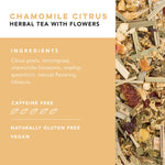 Unwind with the soothing blend of Chamomile Citrus herbal tea, crafted to bring balance and relaxation to your day. Featuring calming chamomile blossoms, bright citrus peels, and a touch of lemongrass, this naturally caffeine-free tea is a gentle escape from stress. The floral, mellow infusion is enhanced with rosehips, spearmint, and hibiscus for a refreshing twist. Whether you're winding down in the evening or seeking a midday refresh, this chamomile blend is the perfect pick-me-up. * Calming chamomile tea with citrus and florals * Smooth, mellow, and soothing infusion * Includes 15 oversized pyramid sachets * 100% compostable plant-based materials with no microplastics * Naturally caffeine-free for all-day enjoyment Ingredients: Citrus peels, lemongrass, chamomile blossoms, rosehips, spearmint, natural flavoring, hibiscus.