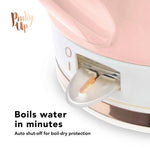 Fashion meets function with this stylish tea kettle. The Noelle Ceramic Electric Tea Kettle features glossy pink ceramic glazing and a trendy rose gold metallic base. Includes a plug-in base, 1.5 L capacity, and an easy on/off switch.