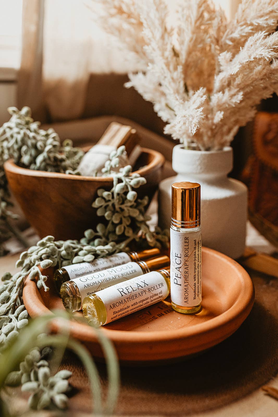 Treat yourself to non-toxic fragrance with You're Golden Co Apothecary's Aromatherapy Rollers -- made with organic ingredients, non-toxic, paraben-free and comes in eco-friendly packaging. 10 mL - glass bottle Directions: Rub onto wrists, neck or behind your ears. Inhale and Enjoy. Ingredients: organic jojoba oil and organic or natural essential oils Scent Options: GOOD MOOD: Organic Essential Oils: spearmint, eucalyptus, and grapefruit VITALITY: Organic Essential Oils: sweet orange, lemongrass, peppermint, and ginger RELAX: Organic Essential Oils: lavender, lemongrass and natural essential oil: Virginia Cedarwood PEACE: Organic Essential Oils: sweet Orange, lavender, patchouli, rosemary, and natural Essential Oil: Virginia Cedarwood Small-batch - Made in Iowa - Women-owned Company Do not use if pregnant or nursing. Discontinue use if adverse results occur.