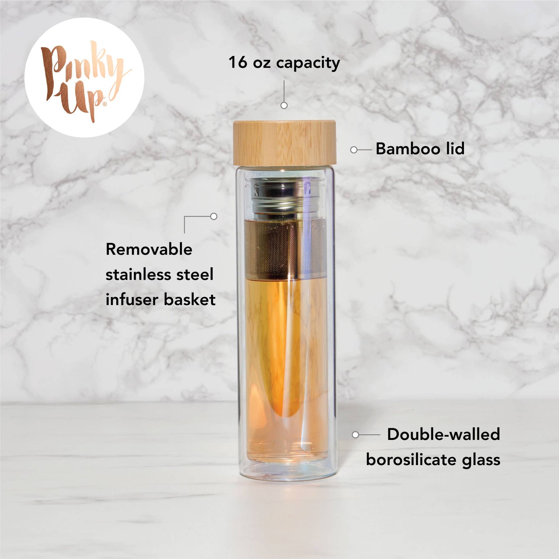 Take tea time anywhere with this chic portable infusing mug. This double-walled 16 oz. mug keeps drinks at the perfect temperature while staying cool to the touch. Includes a detachable strainer and infuser for loose-leaf tea.