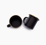 Each item features a speckled enameled surface with hand-finished baked stainless steel trim creating a bronze-like patina finish, resulting in unique pieces that form a cohesive set.